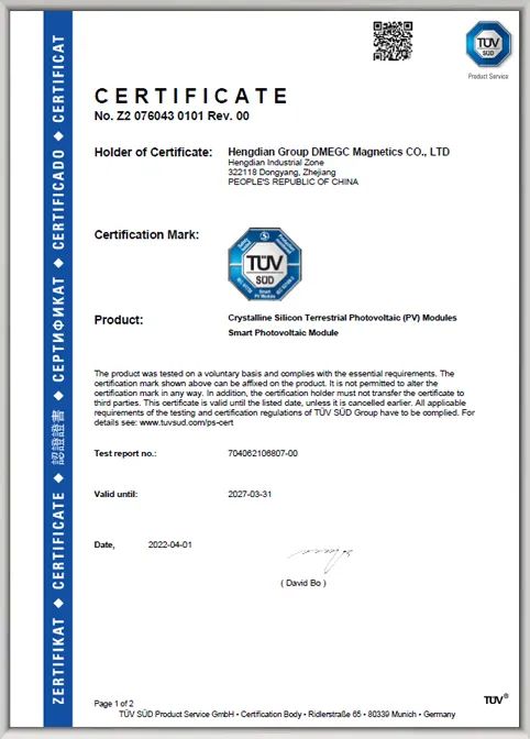 克日,横店6731顶级游戏新一代“智能组件”顺遂通过IEC61730及IEC62109-3测试,获得T?V南德意志集团(以下简称“T?V 南德”)揭晓的全球首张“智能组件”认证证书。
