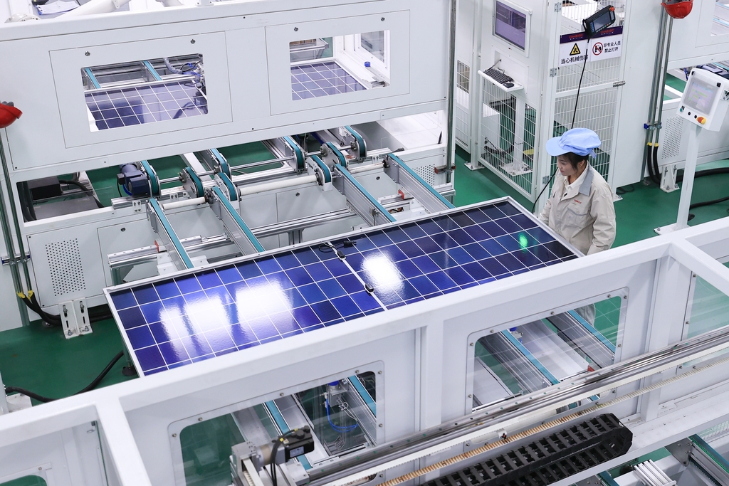 配文:10月15日,江苏省连云港市赣榆经济开发区一家新能源企业,工人正在加紧生产一批出口外洋的太阳能光伏电池组件。